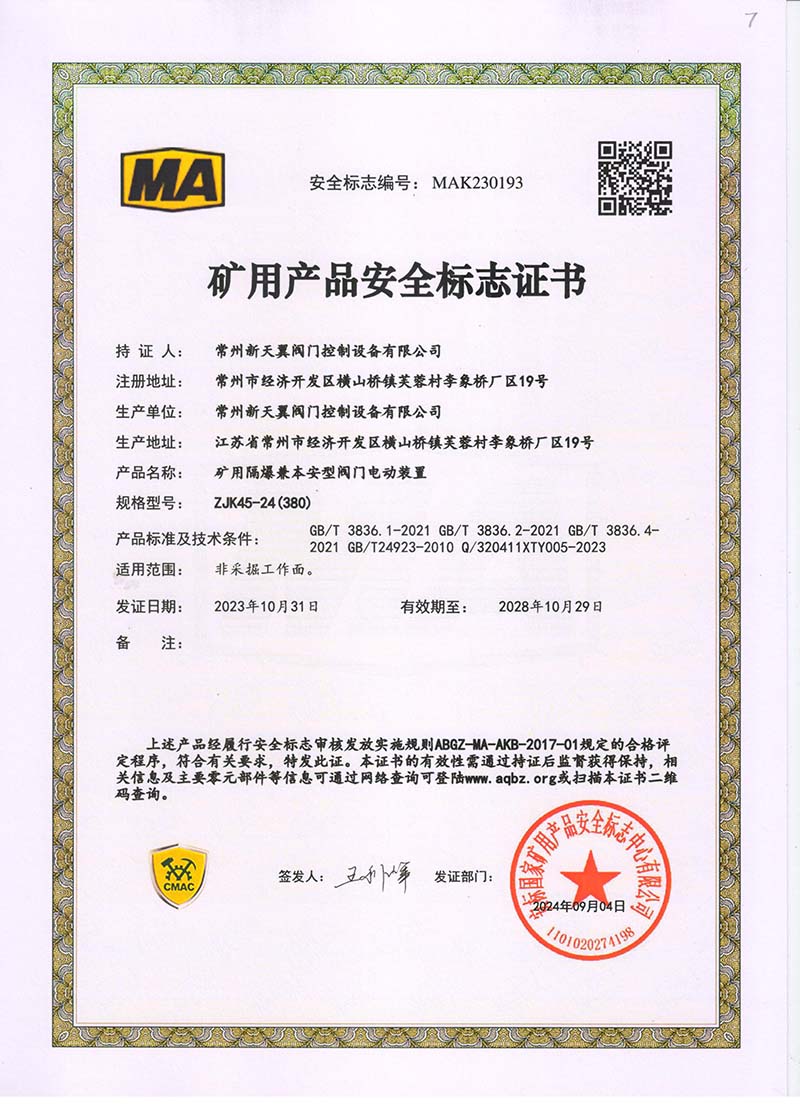 礦用產品安全標志證書ZJK180-24(380)