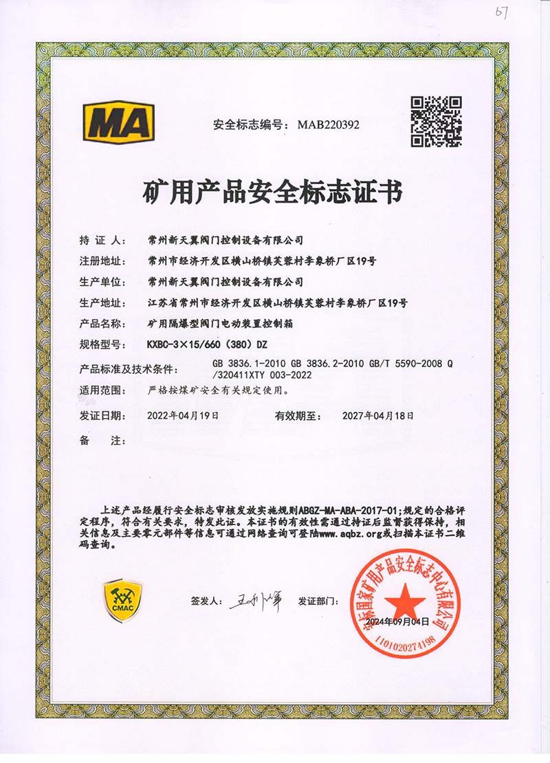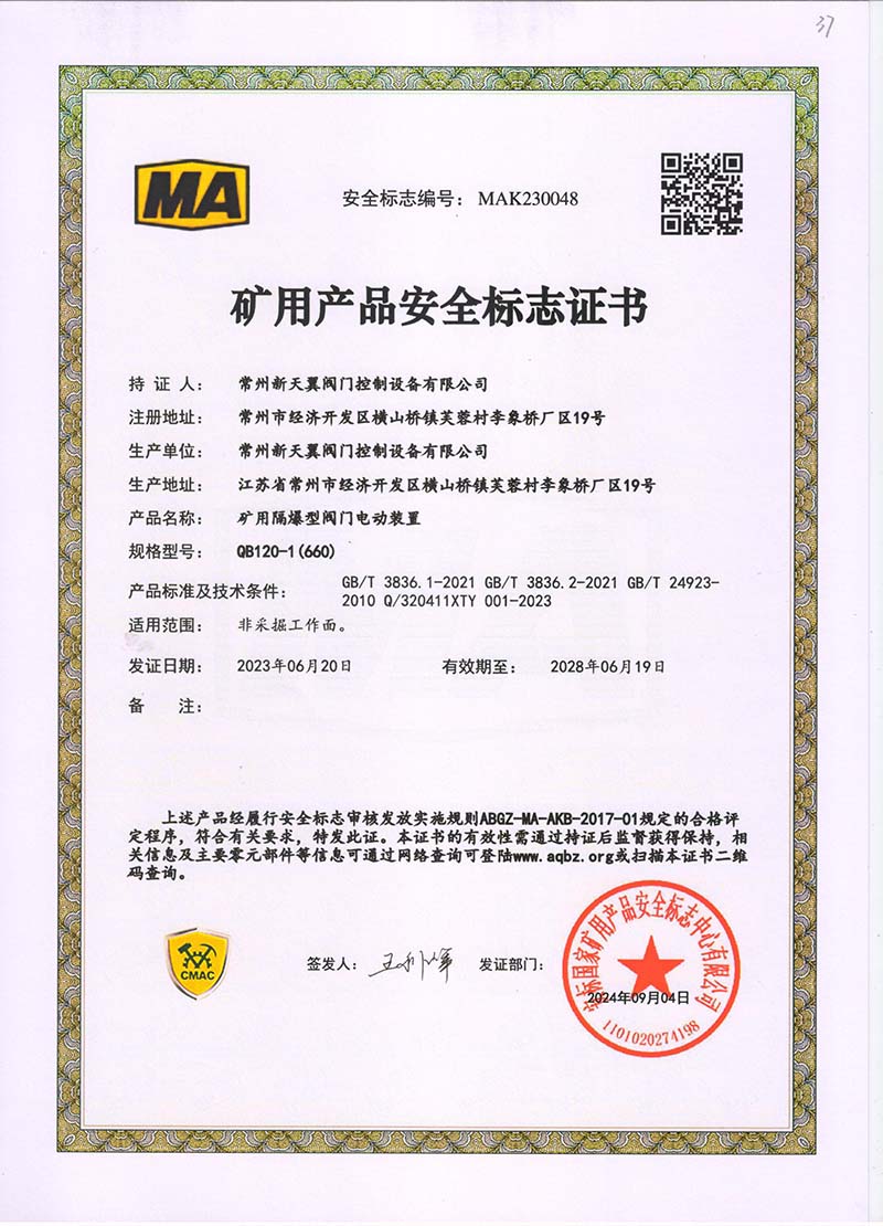 礦用產品安全標志證書QB20-1(380)
