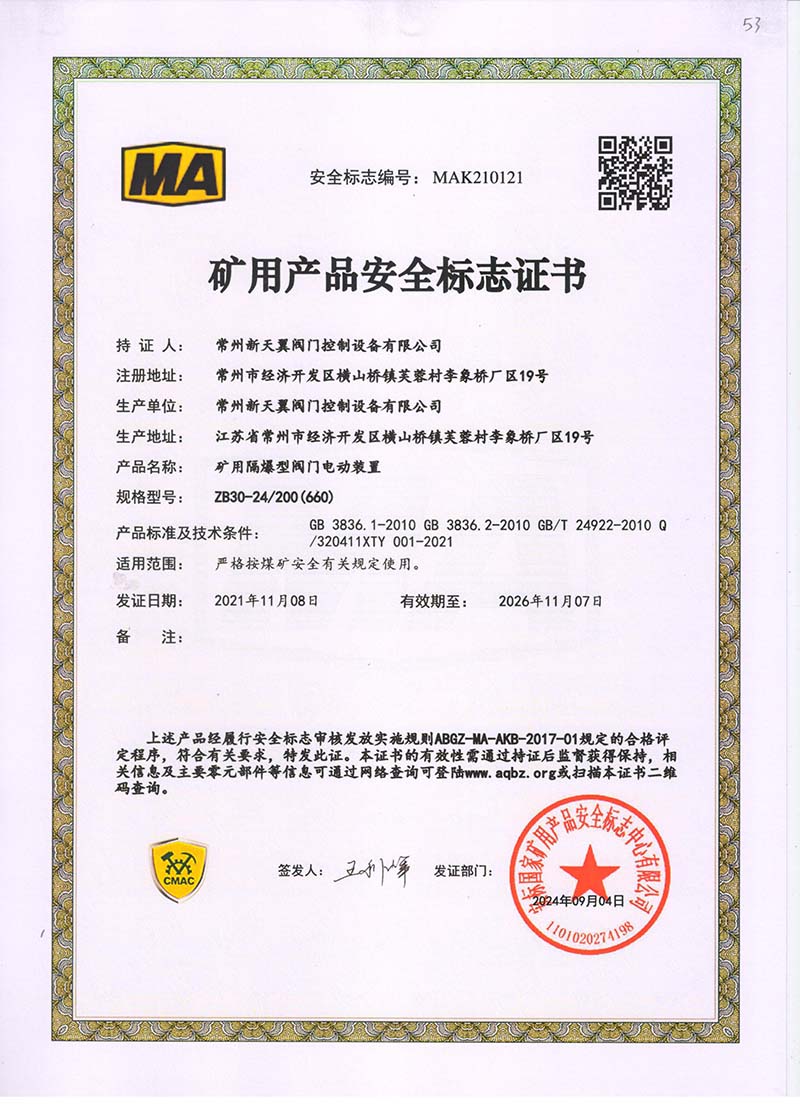 礦用產品安全標志證書ZB30-24 200(660)
